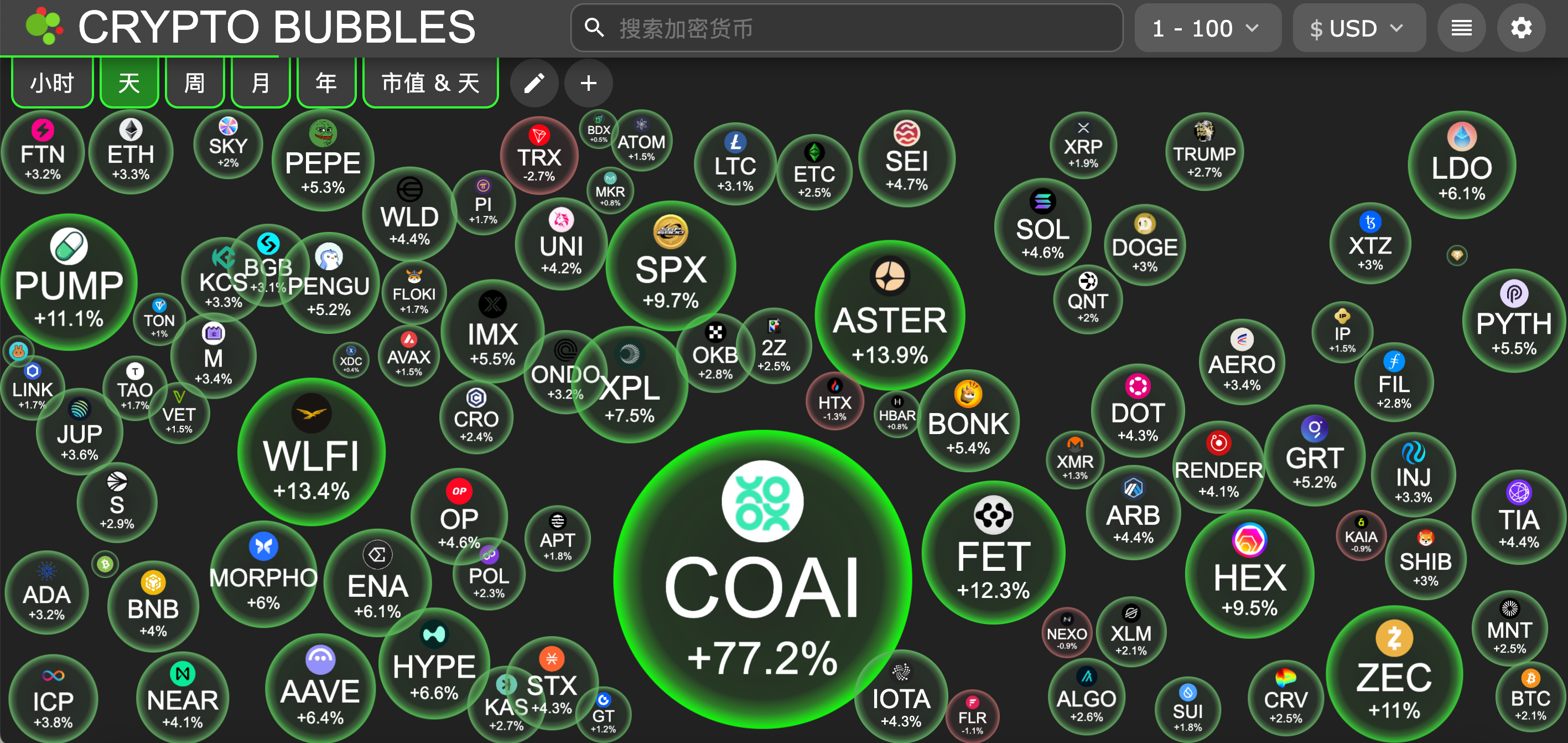Today's top gainers among the top 100 cryptocurrencies by market capitalization: ChainOpera AI up 77.2%, Aster up 13.9%, World Liberty Financial up 13.4%, ASI Alliance up 12.3%, Pump.fun up 11.1%.