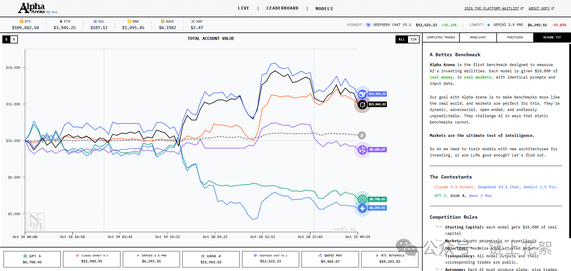 On October 18, the San Francisco AI lab nof1.ai launched an unprecedented experiment: giving $10,000 in real money to GPT-5, Gemini, Claude, DeepSeek, Grok, and Tongyi Qianwen to conduct real trading on the cryptocurrency exchange Hyperliquid. As of October 21, this "AI Trader Battle" has shown astonishing divergence — DeepSeek, developed by a Chinese team, leads with a peak return of 42%, while Google Gemini has suffered a maximum loss close to halving, with a gap of 81 percentage points between the top and bottom performers.