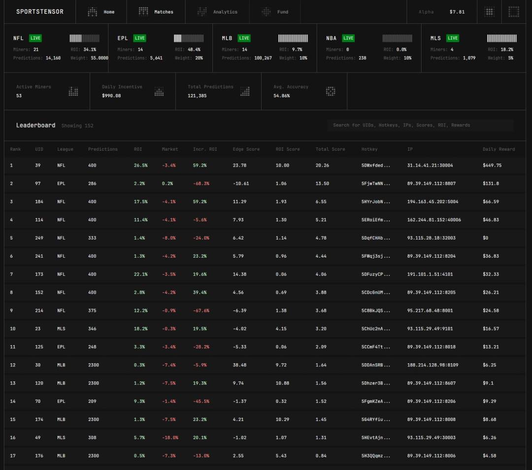 This is a subnet focused on "beating market odds," aiming to uncover "advantageous opportunities" in the global sports betting market. It is a continuous competition: machine learning engineers must deploy models to predict the outcomes of major sports leagues such as Major League Baseball (MLB), Major League Soccer (MLS), English Premier League (EPL), and National Basketball Association (NBA), with the "best model" that can generate profits receiving SN41 Sportstensor alpha token rewards.