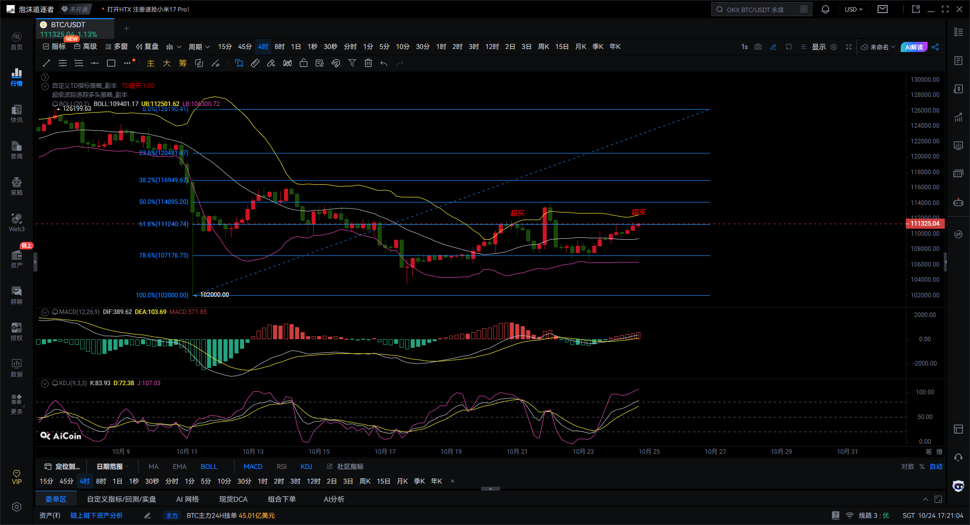 The price is currently oscillating near the Fibonacci 61.8% retracement level, which is a key turning point in technical analysis. If it can effectively break through and stabilize above $111,500, it indicates the end of the pullback and a trend reversal to bullish. If it faces repeated resistance and falls below the middle band, it may retest the $107,000 support or even dip to the bottom support at $102,000. Therefore, the area around $111,200 becomes a critical point for determining the subsequent trend direction, and close attention should be paid to the breakout situation at this level.