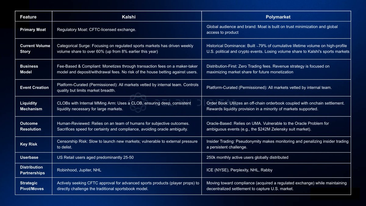 @Kalshi targets US retail investors who value regulatory oversight. Their CFTC-licensed DCM status and Robinhood integration unlock mainstream users that offshore competitors can't touch. Their plan is to become the "S&P 500 of events," positioning as infrastructure rather than a betting platform.