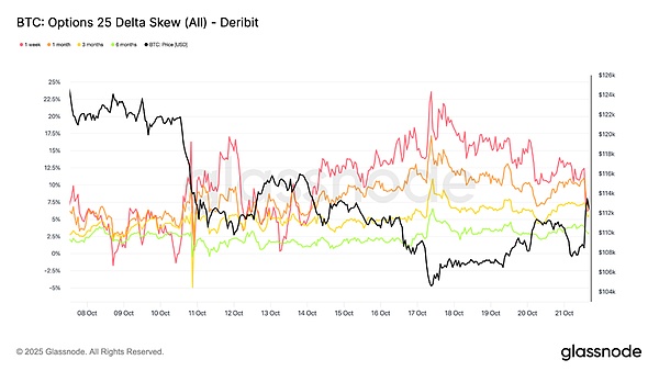 This indicates that during the current downward movement of the price, investors tend to spend more on hedging risks. However, they maintain limited upside exposure, suggesting that while they are fearful in the short term, they still have confidence in Bitcoin in the long run.