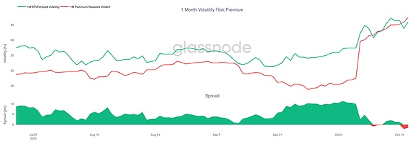 Implied volatility remains high, while actual volatility has begun to rise sharply. The previously calm, low-volatility phase has ended.