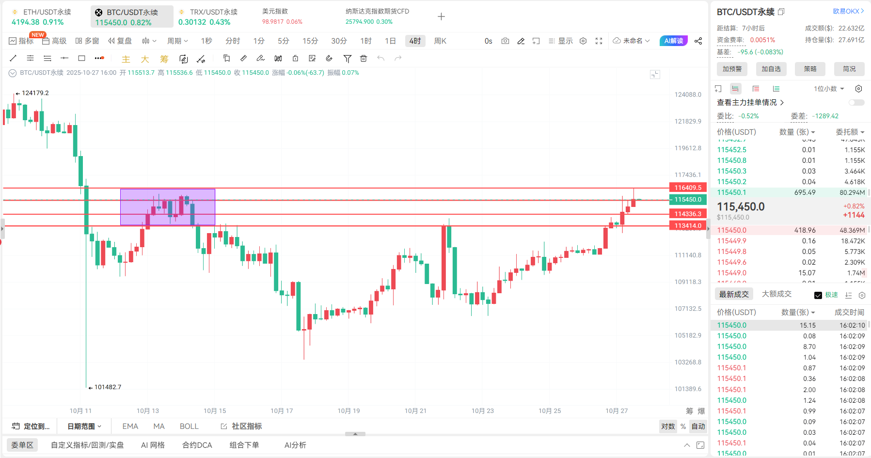 In terms of support, 114.3K is the bullish bottom line; if it holds, the market will lean bullish. After breaking 115K, we will gradually adjust stop-loss and holding ranges to achieve a good risk-reward ratio! The second support at 113.4K, if it drops to this level, indicates that the bears are gathering strength; we need to see if the 200MA can still hold. If it holds above the moving average, the bullish pattern remains intact; if it breaks below, don't fight it, just run! Overall, the downward trend has been broken, the market has reversed, and it is still a rebound logic, but there is resistance above, so don't chase blindly; wait for a pullback! The strategy for the wave on October 27 is also shared with everyone: for long positions, look at the range between 113400 and 114000, enter in batches, targeting 115400; for short positions, we won't consider them for now!