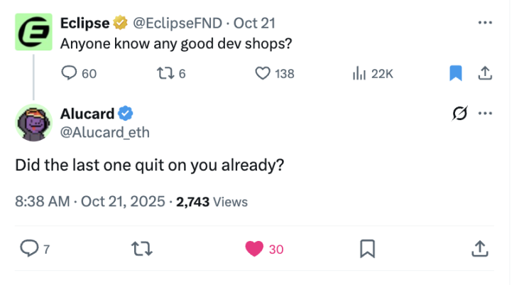 I won't emphasize the token price of Eclipse or any further tweets, but I do find it somewhat ridiculous. Eclipse was doomed to fail from the start because its intent was never to operate a blockchain with a long-term vision; it was always about extracting liquidity.