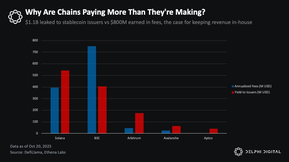 On chains like Solana, BSC, Arbitrum, Avalanche, and Aptos, approximately $1.1 billion in annual revenue flows to Circle and Tether, while the total transaction fee revenue of these ecosystems is only $800 million.