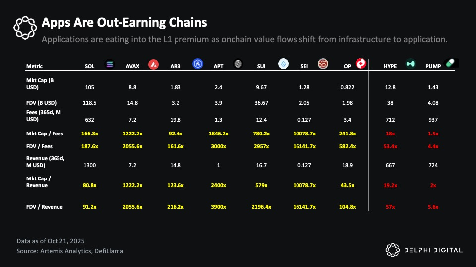 In contrast, Hyperliquid's revenue is $667 million, with an FDV of $38 billion, corresponding to a 57 times FDV multiple, or 19 times circulating market cap. Pump.fun achieved $724 million in revenue, with an FDV multiple of only 5.6 times, and a market cap multiple of just 2 times. These data indicate that applications with strong product-market fit and distribution capabilities are achieving substantial revenues at valuation multiples far below those of infrastructure layers.