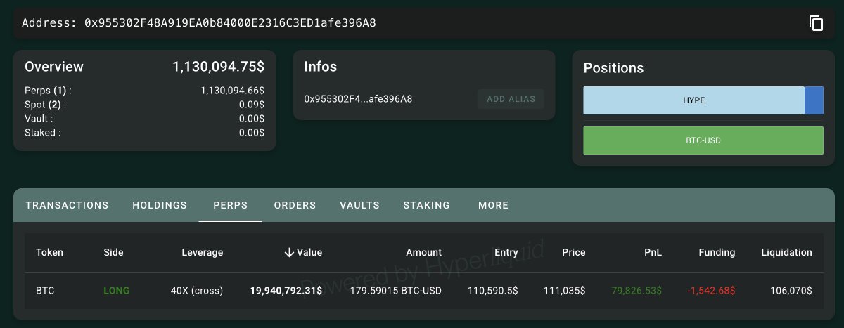 • Trader 0x9553 opened his first position on #Hyperliquid — a 40x long on 179.59 $BTC($19.94M).