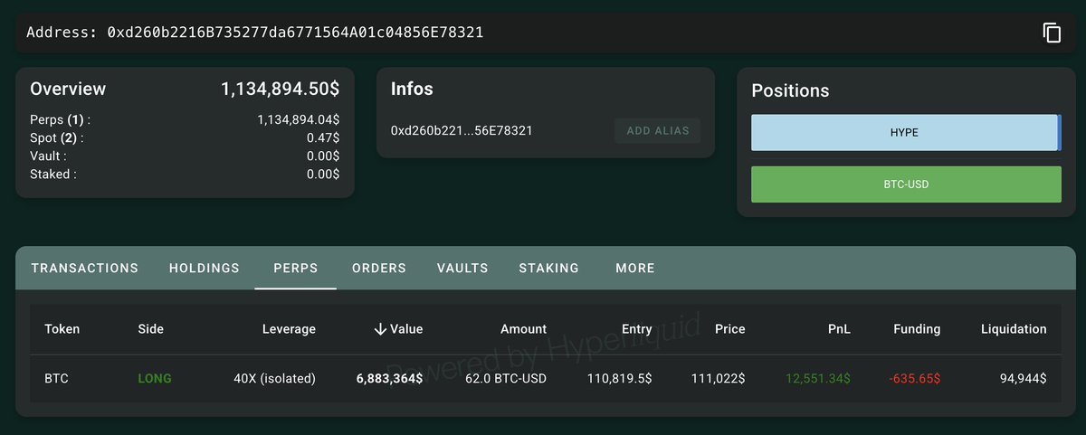 • Trader 0xd260 has completed 43 trades on #Hyperliquid with an 83.72% win rate and $2.6M+ total profit, now opening a 40x long on 62 $BTC($6.88M).