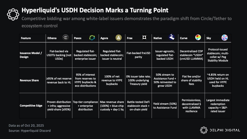 To capture this back, Hyperliquid ran a competitive bidding process where major stablecoin providers like Native Markets, Paxos, and Ethena competed for the USDH ticker.