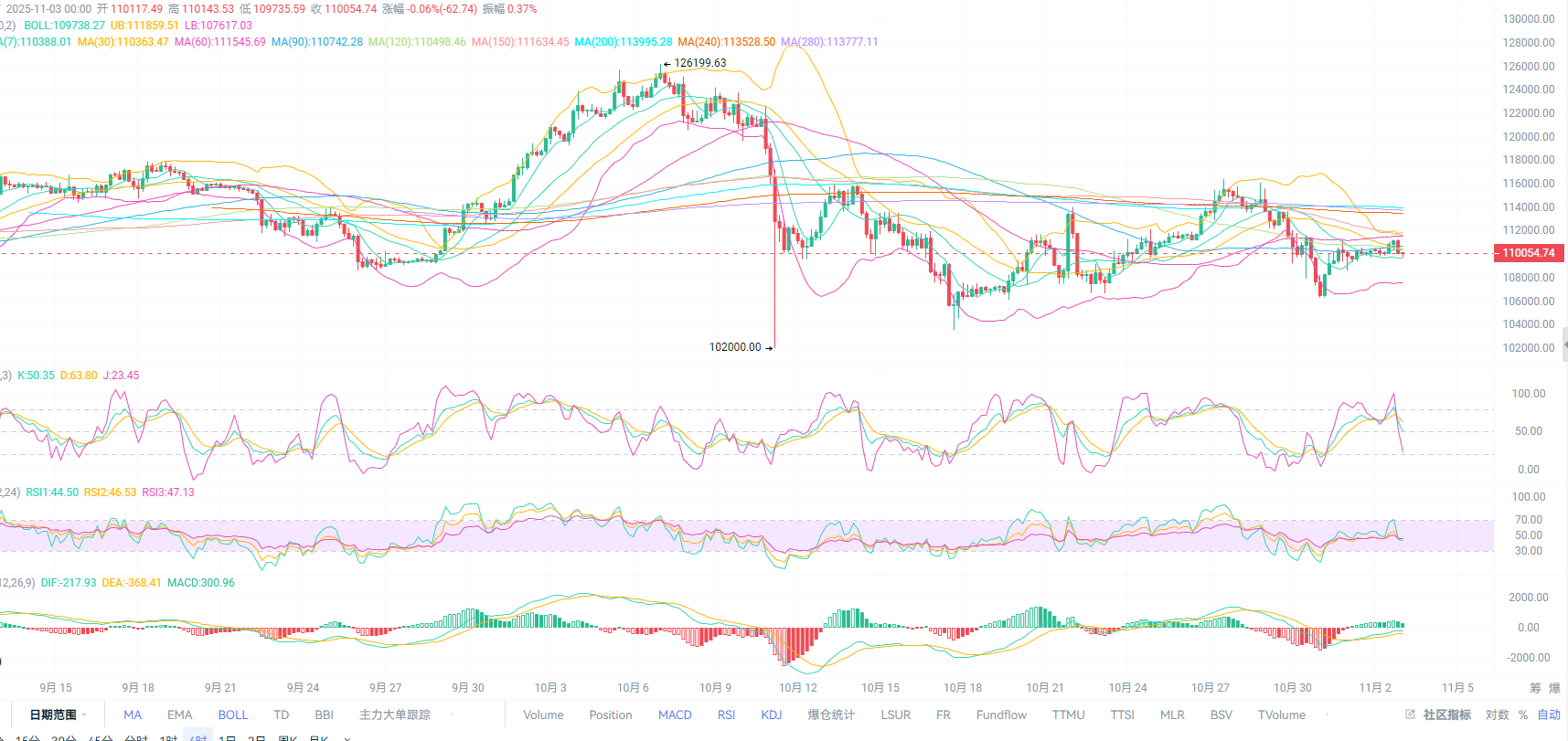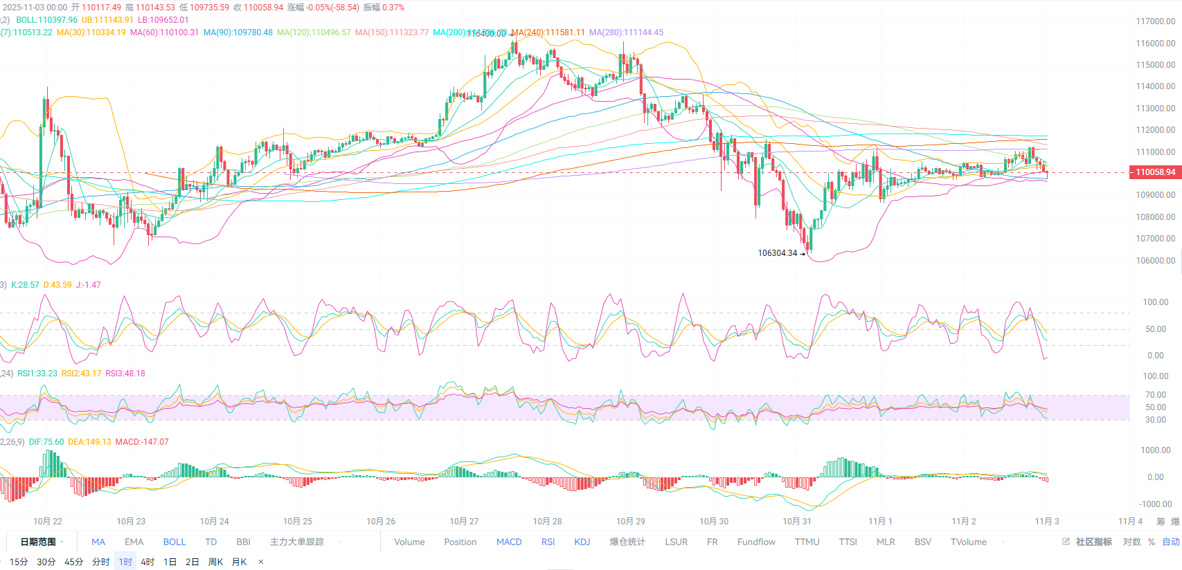The current price of Bitcoin is around 110,000. In yesterday's article, Red Sister accurately predicted the resistance above the 1-hour MA280, and the market has declined as expected in the evening. It is currently testing the MA90 and lower support. From the MACD, the red bars continue to increase in volume, and the DIF and DEA are widening their death cross. The DIF line is approaching the 0 value position, while both KDJ and RSI are approaching oversold territory with a downward posture, indicating that the bearish momentum is not yet over. Red Sister suggests that those who have positioned themselves can enter a high short at 111,000, taking profit and reducing positions to continue holding!