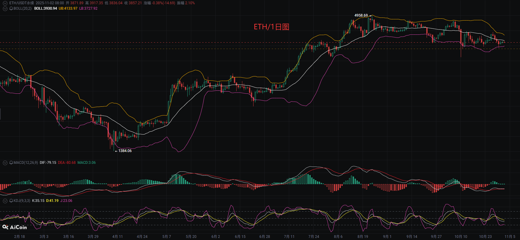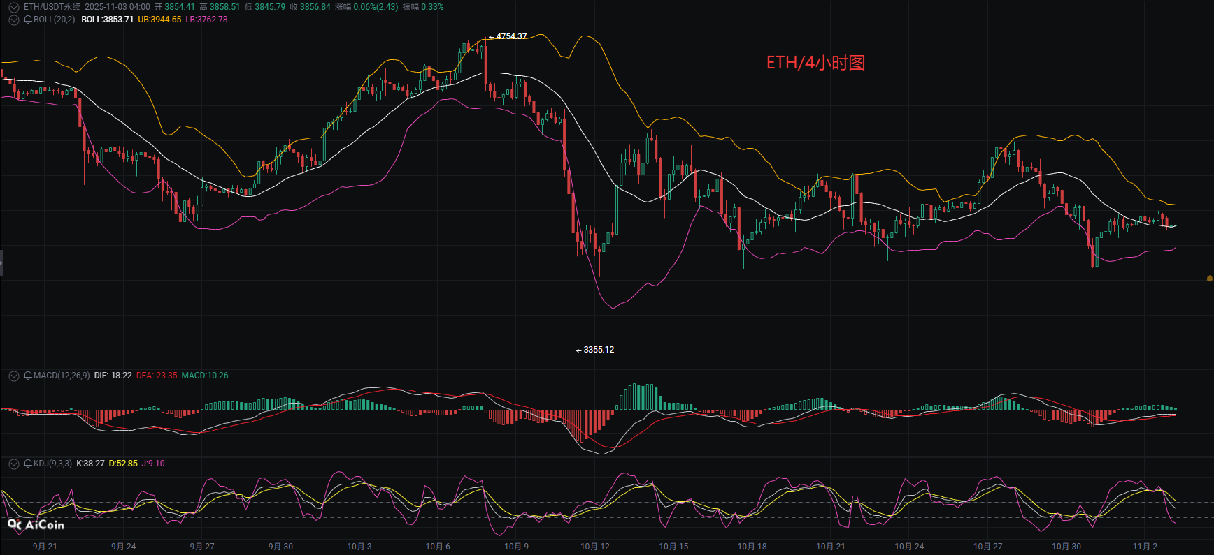Yesterday, Ethereum's market continued to experience wide fluctuations, with a slight price increase. The upward momentum was not strong, and it tested the resistance at the 3900 level again, with the intraday high around 3917 facing pressure and pulling back. The short-term increase has begun to weaken, and the intraday fluctuation remains unchanged. According to technical analysis, the current trend has formed a double top structure (with highs at 3917 and 3910) on the 4-hour level, effectively breaking below the neckline at 3850.