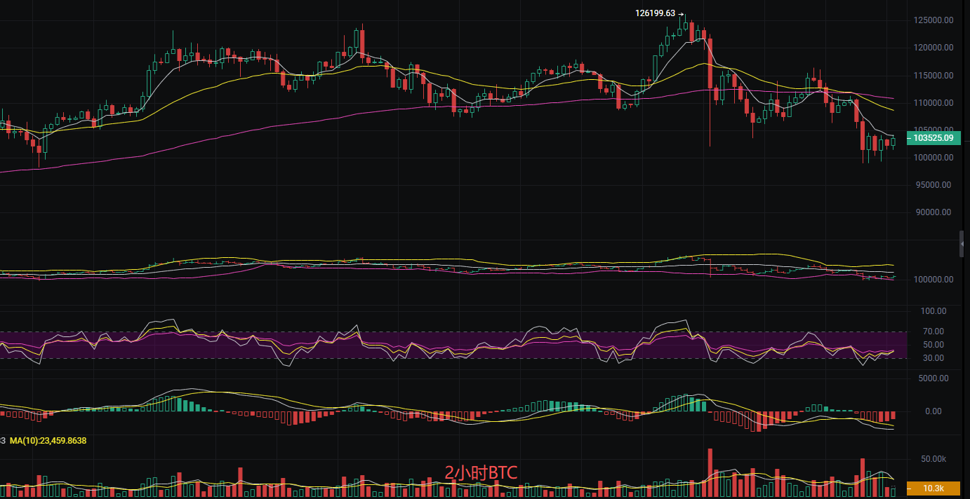 The current price of Bitcoin is 103,323. Li Ying assesses that Bitcoin has reached a critical support and resistance level in the short term. Technical signals indicate that short-term momentum has strengthened, but Li Ying believes the long-term trend remains bearish. Specifically, a bullish engulfing pattern has formed in the short term, resonating with the upward slope of the short-term moving averages, suggesting potential for further price increases. However, Li Ying notes that the long-term moving average system is still in a bearish arrangement. The low points of the 2-hour oscillating upward trend are gradually rising, and the high points are continuously breaking through, indicating enhanced short-term bullish strength. The daily engulfing pattern has turned the previous bearish candle into a slightly bullish configuration. The MACD shows increased momentum on the 2-hour chart, and the EMA short-term moving averages are in a bullish arrangement, providing strong support. Despite this, Li Ying maintains a bearish stance on the larger trend, so the strategy is to go long, take profits, and then open short positions while ensuring proper risk control.