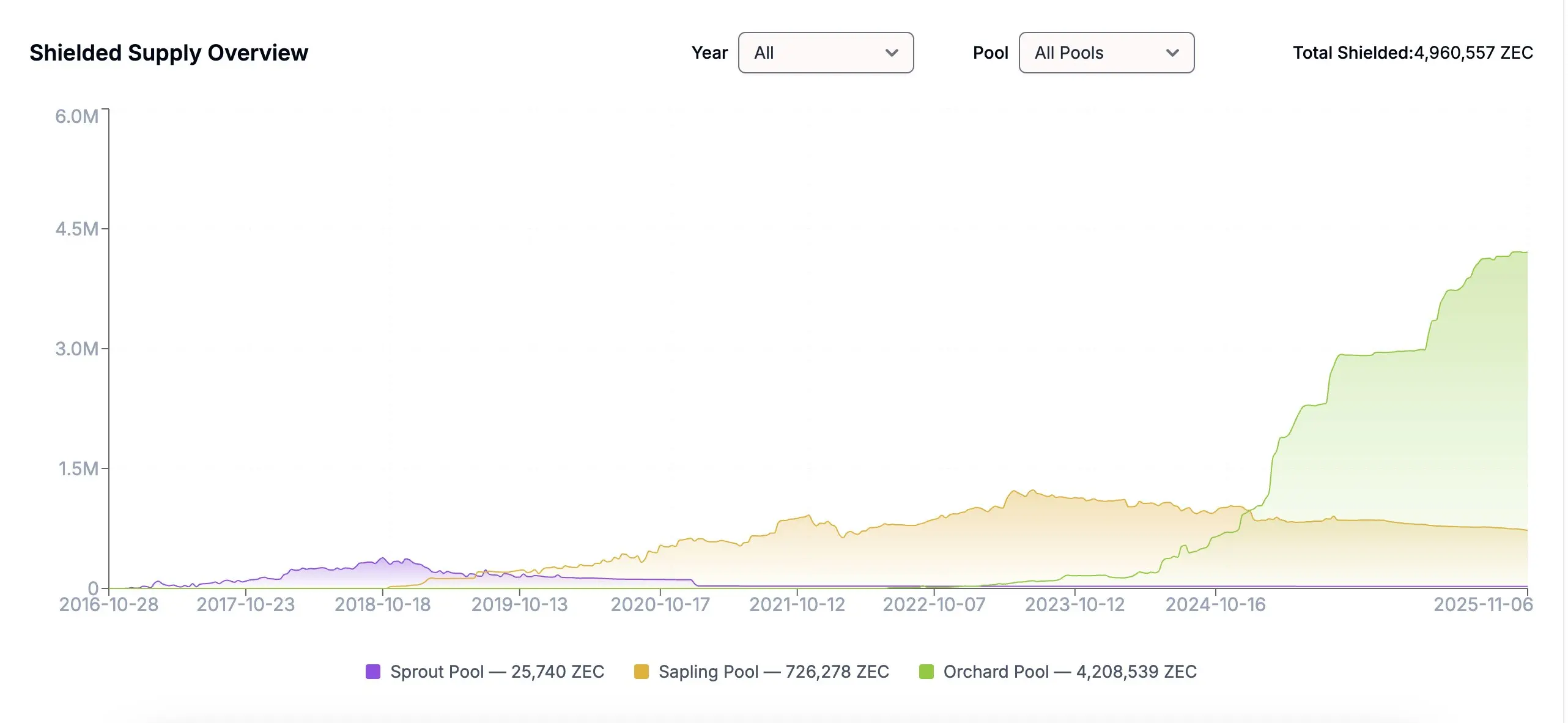 The balance of ZEC's shielded pool increased from 4 million coins to 4.9 million coins in 40 days, a growth of 25%; the proportion of shielded transactions rose from less than 10% to 25-30%, indicating that more and more users are choosing completely anonymous trading methods. The more users there are, the stronger the privacy guarantee, and the more evident the network effect becomes.