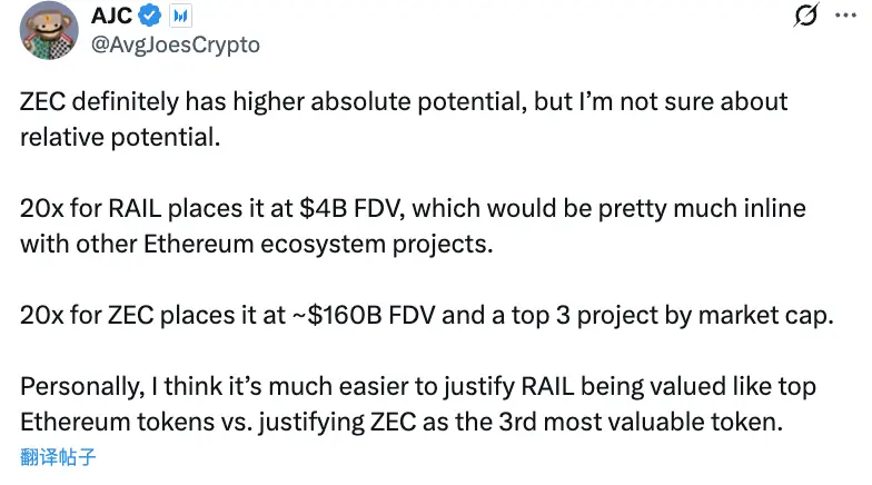 From a valuation perspective, the potential for price increases between the two shows a huge difference. If RAIL rises 20 times, its fully diluted valuation (FDV) will reach $4 billion, which is consistent with the valuations of other top projects in the Ethereum ecosystem, making it easy for the market to understand and accept. But if ZEC rises 20 times, its FDV will reach $160 billion, making it the third-largest crypto asset by market capitalization, second only to Bitcoin and Ethereum. This requires the market to believe that ZEC can truly stand on equal footing with Bitcoin and Ethereum—an extremely high threshold.