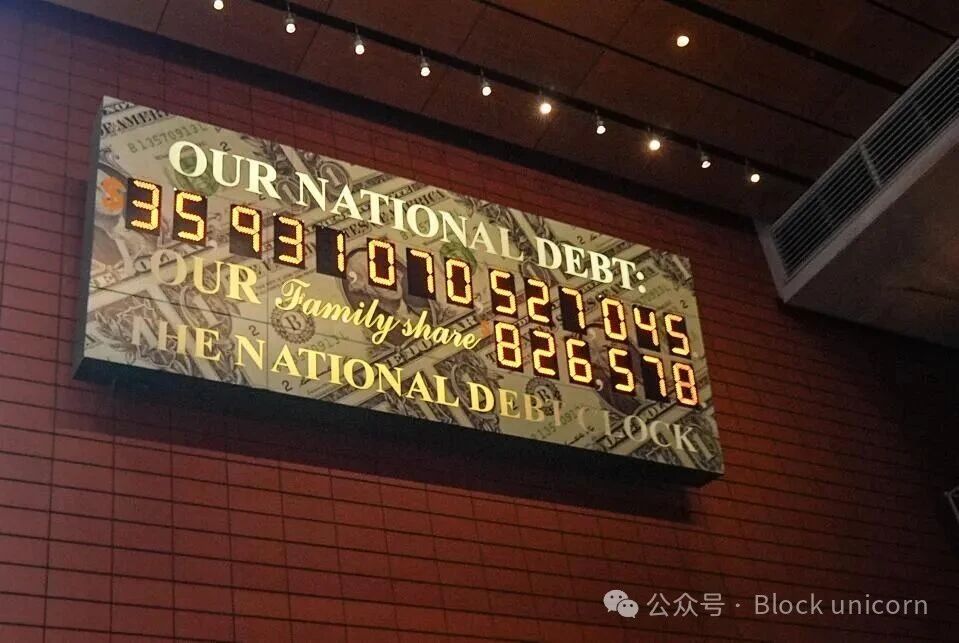 The U.S. national debt clock tracks U.S. Treasury debt in real-time and its proportion in American households, vividly reminding people of the growing fiscal burden in the U.S. (Image source: Selcuk Acar/Anadolu via Getty Images)