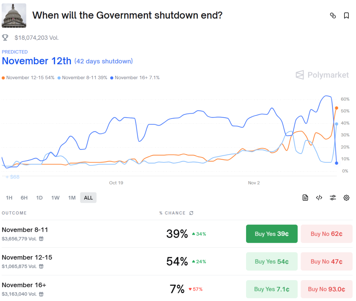 Data from Polymarket shows that the market's bet on the end of the government shutdown before November 11 has risen to 39%, while the probability for November 12 to 15 is 55%. The total trading volume in this prediction market has exceeded $18.1 million.