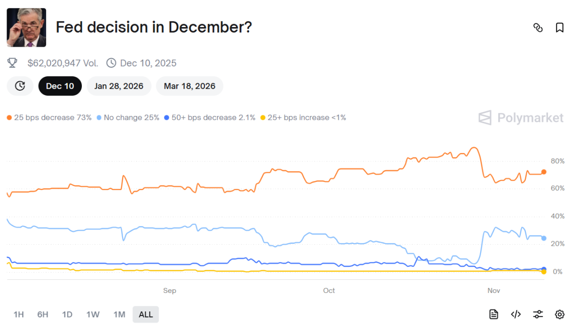 In addition, data from Polymarket shows that the market's bet on a 25 basis point rate cut by the Federal Reserve in December has risen to 73%, which will continue to inject liquidity into risk assets.