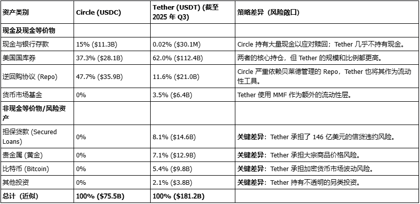 Comparison of Circle and Tether's reserve asset composition (data as of the third/fourth quarter of 2025)