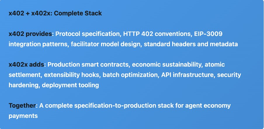 Coinbase's x402 protocol represents significant progress in solving a problem that has persisted for thirty years. The specification establishes HTTP 402 as a payment signaling mechanism, integrates EIP-3009 for gasless transfers, defines the coordinator role for settlement coordination, and creates standard HTTP headers for payment metadata. This foundational work enables developers to implement HTTP 402 payments on EVM blockchains through standardized interfaces. The specification has gained widespread attention due to Coinbase's institutional support, integration potential with Google's A2A protocol, and the growing developer ecosystem. However, like any protocol specification, x402 needs implementable solutions that can address real operational issues for production environments, such as economic sustainability models, performance optimization strategies, security hardening measures, scalability frameworks, and practical deployment patterns. This is not a criticism of x402. All successful protocols require an implementation layer that complements the specification.