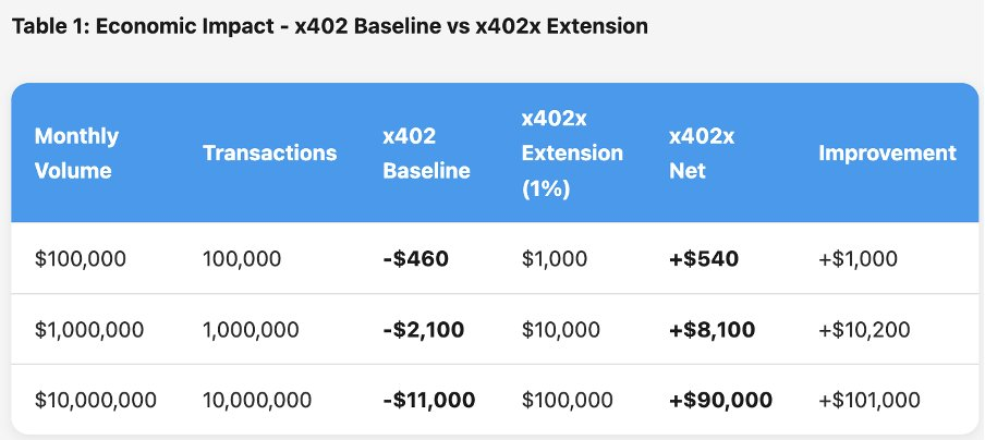 x402x adds a configurable and optional platform fee mechanism (more like a merchant fee) on top of the x402 specification. x402 defines the payment process, while x402x expands on this to create sustainable economic benefits: in the case of 1 million transactions, payment service providers can earn $8,100 in profit per month instead of losing $2,100, thereby creating a viable business model for infrastructure operators at scale.