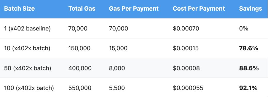 x402x expands the functionality of x402 by adding batch settlement capabilities, significantly reducing the cost per transaction. The executeBatchRequest() function can aggregate up to 100 payments into a single transaction, spreading fixed costs (signature verification, contract initialization, event emission) across multiple settlements. The server-side BatchProcessor service automatically queues payments and settles every 2 seconds. For merchants processing 100,000 payments monthly, this extension can reduce costs from $70 to $5.50 while still maintaining separate event emissions for each payment.