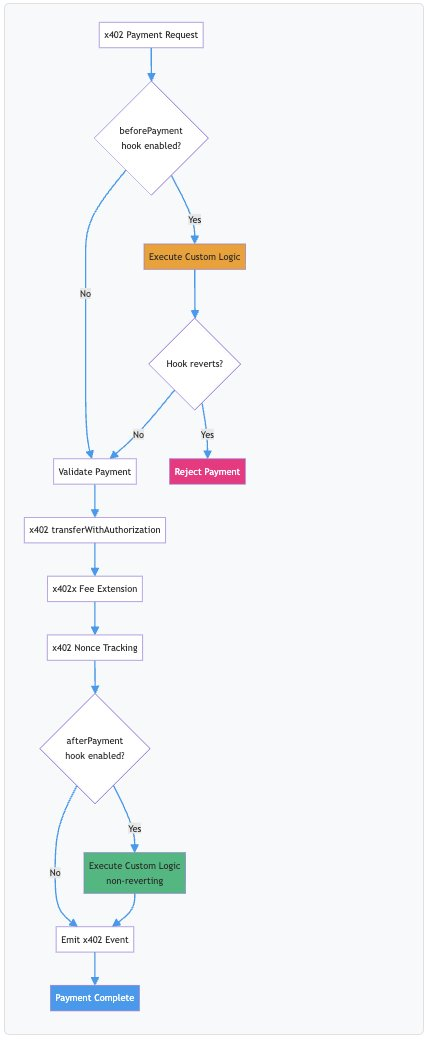 x402x adds four custom hooks to the fixed payment process of x402: beforePayment, afterPayment, beforeBatchPayment, and afterBatchPayment. Merchants can inject TypeScript functions containing the complete payment context (sender, amount, token, timestamp, metadata). The before hook can roll back transactions to enforce business logic. The after hook is non-reversible since the payment has been settled on-chain. This extension allows for application-specific logic (such as credential checks, subscription validation, NFT minting, membership programs, etc.) without modifying the core x402 protocol.