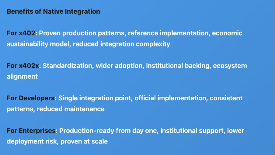 x402x demonstrates a mature model that can be applied as a native feature in x402. The configurable fee mechanism provides a validated economic model for the protocol's sustainability. Atomic settlement offers an alternative to intermediary coordination with lower latency and simplified infrastructure. The hook system supports application-specific extensions without modifying the protocol. Batch processing significantly reduces costs for large-scale applications. The multi-token architecture expands the ecosystem's coverage. These extensions meet the operational demands faced by enterprises during deployment while maintaining full compatibility with x402. By natively integrating the x402x model into x402, Coinbase can provide both the specification and reference implementation in a single package, accelerating the adoption of x402 and reducing integration complexity for developers.