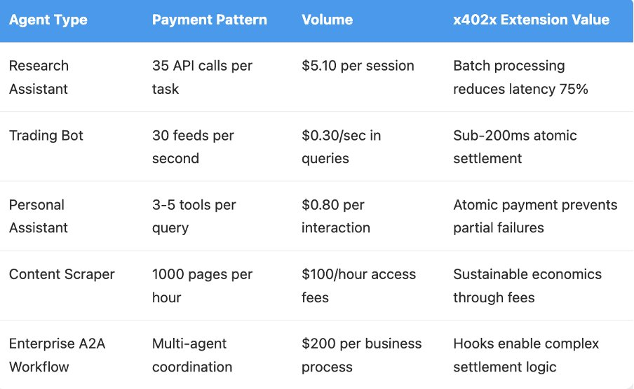 AI agents need to pay service fees at machine speed and scale. An autonomous research assistant querying academic databases, patent archives, and news APIs may need to execute 35 payments per task. A trading bot monitoring exchange dynamics can process 30 payments per second. A multi-tool interface similar to ChatGPT can pay for weather data, flight searches, and price histories in a single conversation. These use cases require both the protocol specification (x402) and the extensions (x402x). The specification ensures interoperability between different implementations, while the infrastructure ensures reliable large-scale operation. Together, they enable the agent economy to operate with the same maturity of payment infrastructure as traditional internet commerce did decades ago.