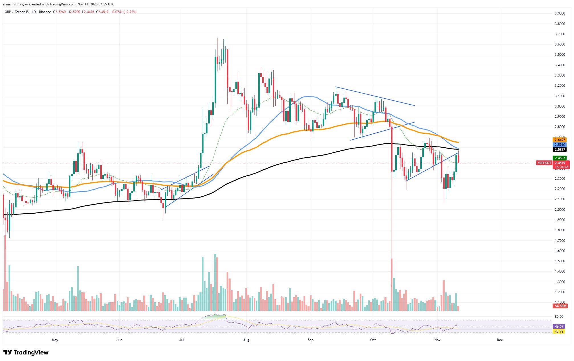 The rally of XRP just crashed headlong into supply. The price failed at about $2.40-$2.50, just below a confluence of moving averages and previous breakdown levels, following a strong rebound off sub-$2.20. The 100/200-EMA was still overhead and sloping down when the rejection occurred, precisely where the 26-EMA/50-EMA cluster descends. Every bounce dies into the MA stack in this traditional bear-market architecture.