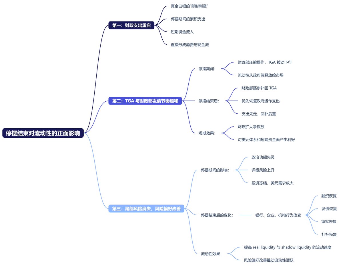 To clarify, during the shutdown, the Treasury had no money to spend and could only use cash from the treasury, which effectively pushed government account funds into the market. After the shutdown ends, although the Treasury will need to replenish this money, it will not drain the market all at once. Instead, it will first activate all government expenditures and then gradually replenish. This will result in a net injection into the market.