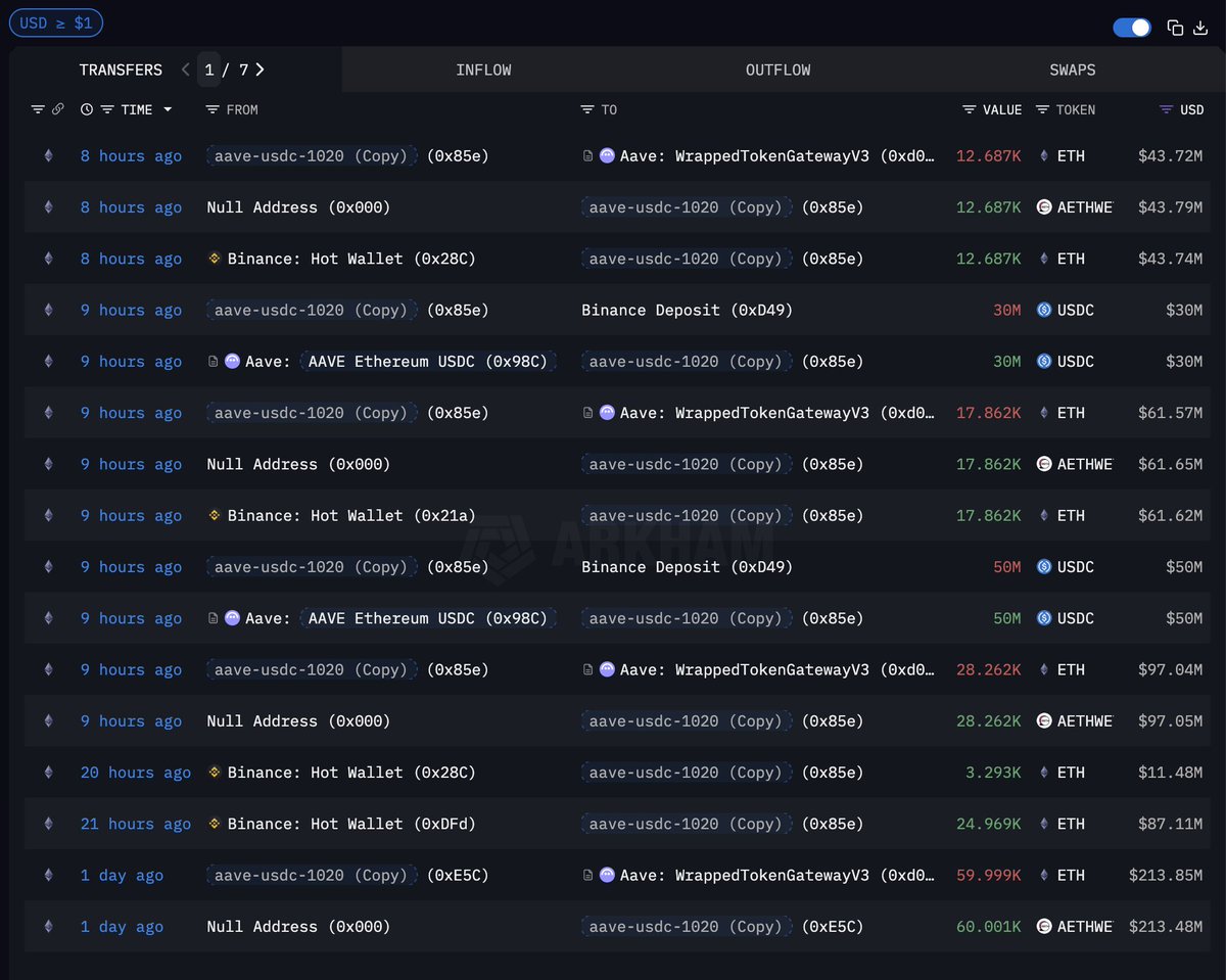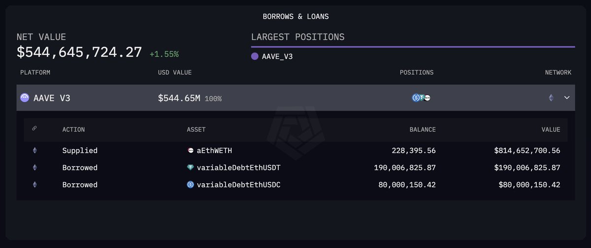 This whale currently owns $563.9M of ETH directly through spot holdings as well as $818.7M in a loan position on AAVE. He has just added another $105.36M of ETH today alone.