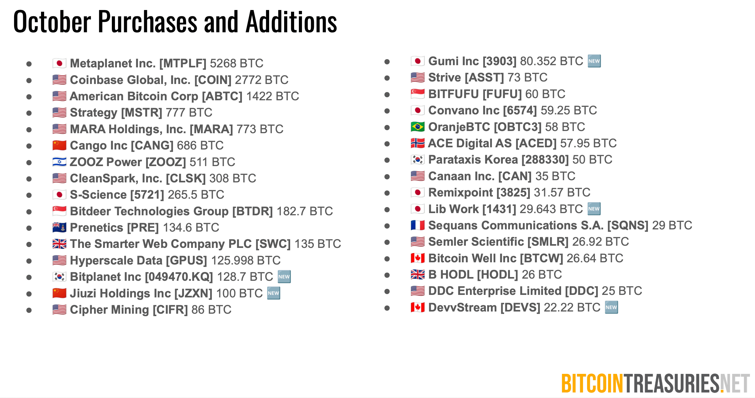 More than 1.05 million BTC, part of the total 4.05 million BTC tracked by Bitcoin Treasuries. - Which company added the most Bitcoin in October?