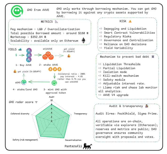 GHO (Issued by Aave): Yields come from borrowing fees.