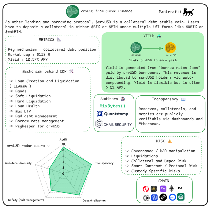 Specific Risks: The CDP model of crvUSD (healthy ratio of 150-167%, backed by BTC/ETH LST) focuses on lending, making liquidation chain reactions a major risk during market volatility, with yields sourced from flexible fees, typically yielding over 3.5% APY.