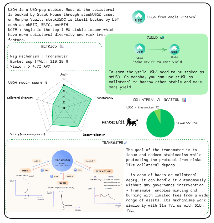 Specific Risks: The converter target of USDA aims to prevent depeg by allowing minting/burning with limited fees (e.g., the same for $1 million TVL and $1 billion TVL), but this also introduces autonomy risks, such as governance operating without intervention, making it susceptible to hacks or the failure of its 85% steakUSDC-backed collateral.