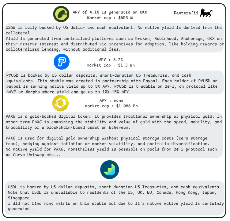 1:1 backing with fiat or equivalent assets, with yields primarily coming from reserves (like government bonds). Base yields are typically not distributed to users but are used for corporate operations.