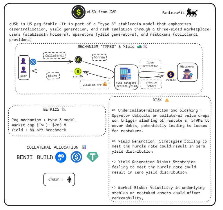 Specific Risks: cUSD emphasizes decentralization, yield generation, and risk isolation through a tri-party market (holders, generators, re-stakers), which introduces unique haircut risks for re-stakers. Its yield (based on an 8% annualized rate) relies on the effectiveness of the loan protection mechanism, facing risks if it fails.