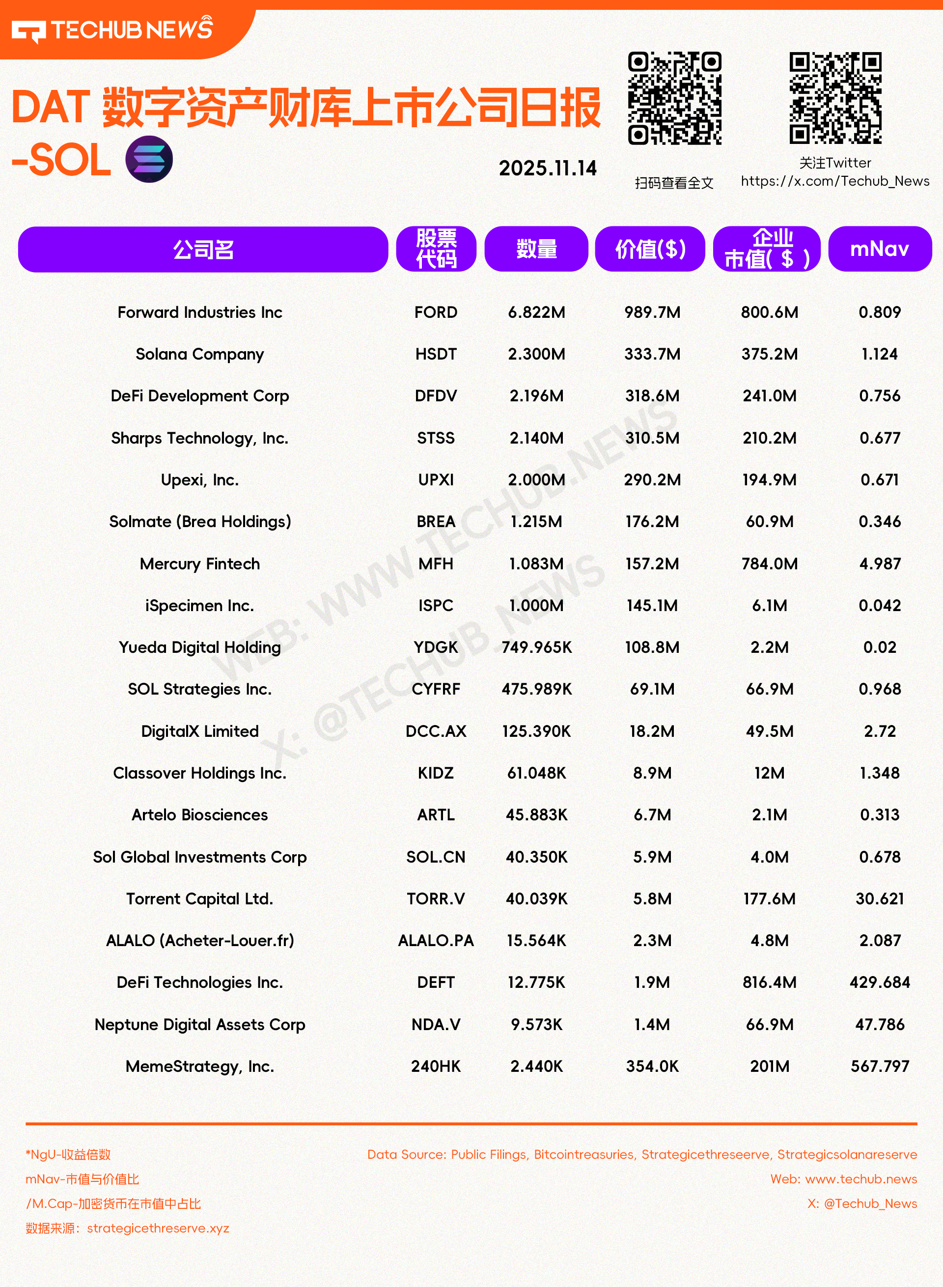 [TECHUB NEWS Digital Asset Treasury Daily (November 14, 2025 - SOL Edition)] Forward Industries Inc leads with 6.822 million SOL, valued at $989.7 million, while companies like Solana Company present diverse layouts in terms of holdings, market cap, and value ratio, showcasing the integration dynamics of SOL and listed companies. Scan the code for the full text for in-depth interpretation.