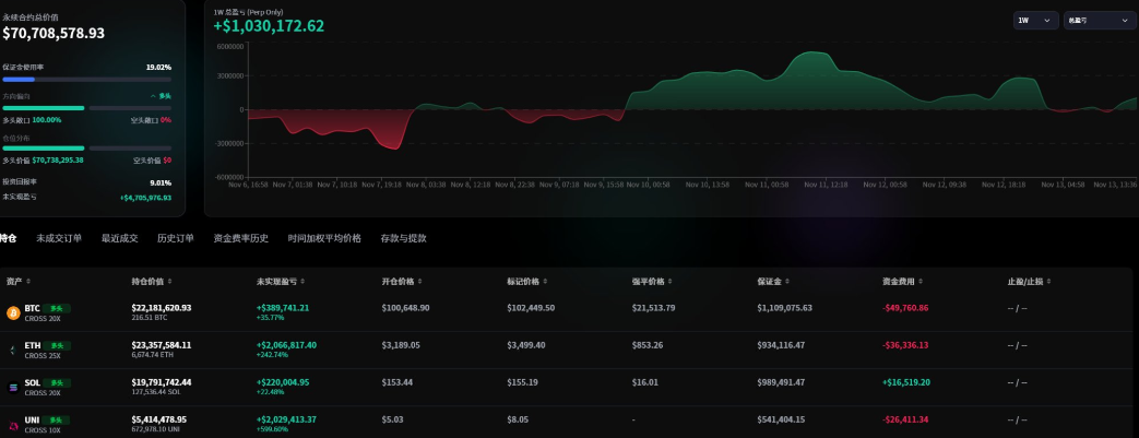 UNI long positions performed exceptionally well, with a floating profit of $1.90 million, and a profit ratio as high as 360%. The holding size is approximately $5.29 million, with an average price of $5.02. The liquidation price is $4.5419.