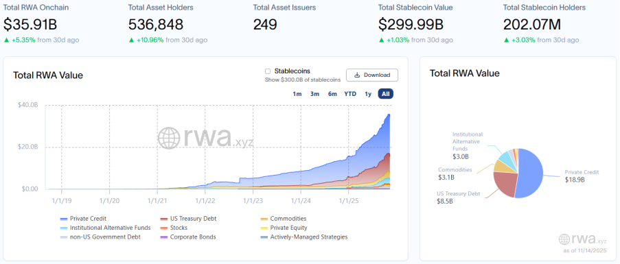 According to the latest data from RWA.xyz, as of November 14, 2025, the total on-chain market capitalization of RWA reached $35.91 billion, an increase of 5.35% compared to the same period last month, with a significant slowdown in growth rate; the total number of asset holders exceeded 536,800, up 10.96% from the same period last month, maintaining strong growth; the total number of asset issuers increased to 249.