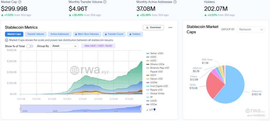 The total market capitalization of stablecoins reached $299.99 billion, a slight increase of 1.03% compared to the same period last month; monthly transfer volume rose to $4.96 trillion, a significant increase of 30.49% compared to the same period last month; the total number of monthly active addresses increased significantly to 37.08 million, up 25.38% from the same period last month; the total number of holders steadily grew to 202 million, a slight increase of 3.03% compared to the same period last month. Both metrics validate the deepening of the market's efficiency-driven growth model, with the turnover efficiency of existing funds and user activity continuing to improve, further strengthening on-chain payment and settlement functions. Data indicates that the resonance between institutional large settlements and retail transactions continues, with transfer volume growth and active address growth far exceeding market capitalization growth, highlighting an improvement in market health. The leading stablecoins are USDT, USDC, and USDS, with USDT's market capitalization increasing by 1.63% compared to the same period last month; USDC's market capitalization slightly increased by 0.28% compared to the same period last month; USDS's circulation reached the $10 billion mark, climbing to third place in the stablecoin track, with a significant increase of 12.36% compared to the same period last month.