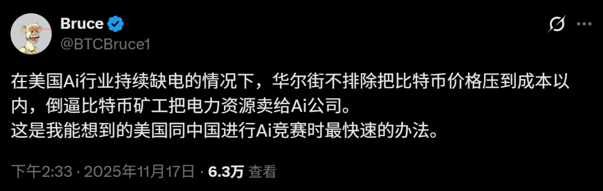 At the same time, discussions about BTC shutdown prices, mining company liquidations, and cyclical reshuffling have begun to emerge. However, unlike previous discussions, the core assumption of this round of discussions is no longer the internal supply and demand of Crypto, but rather a new macro fact: AI and Crypto are now competing for electricity from the same energy pool.