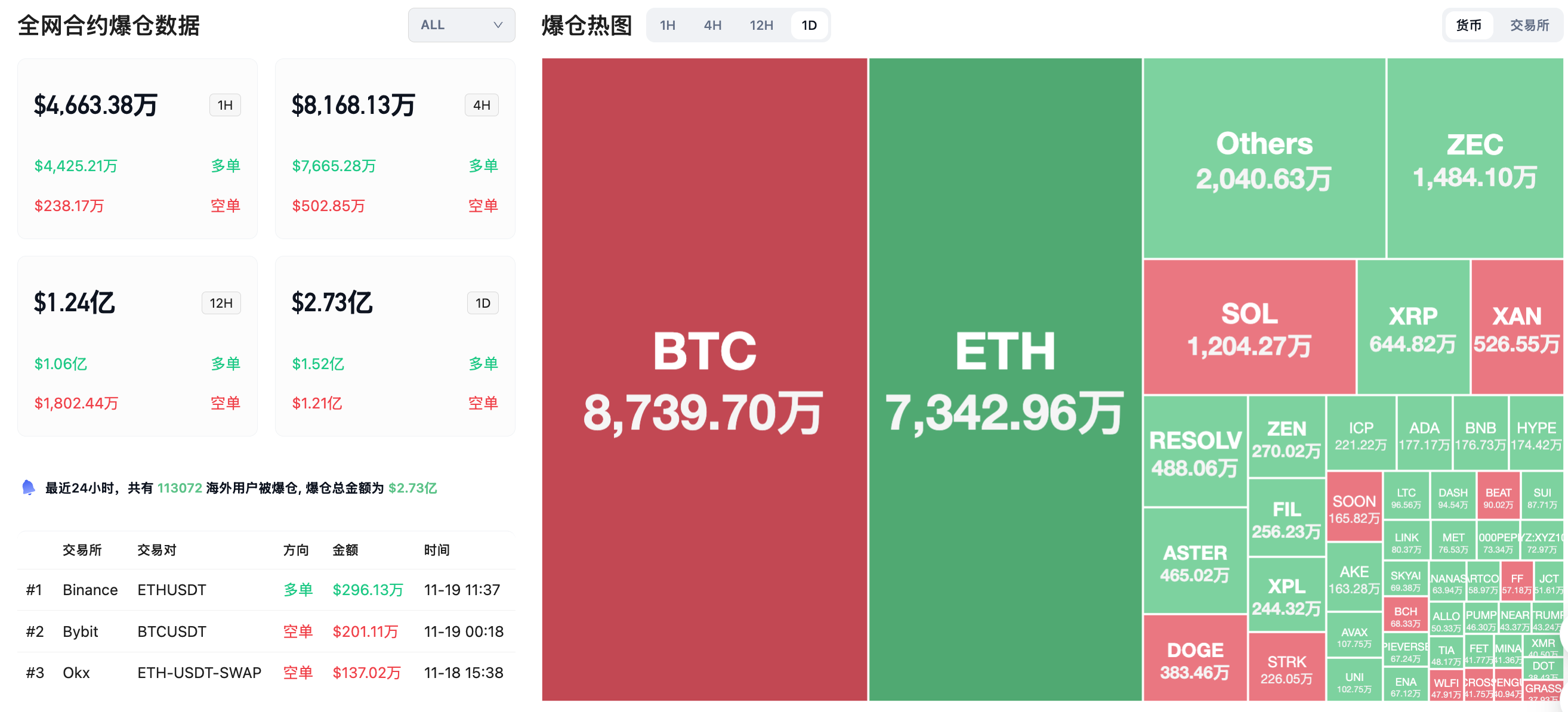 • 24-hour liquidation data: A total of 113,072 people were liquidated globally, with a total liquidation amount of $273 million, including $87.39 million in BTC, $73.42 million in ETH, and $12.04 million in SOL.