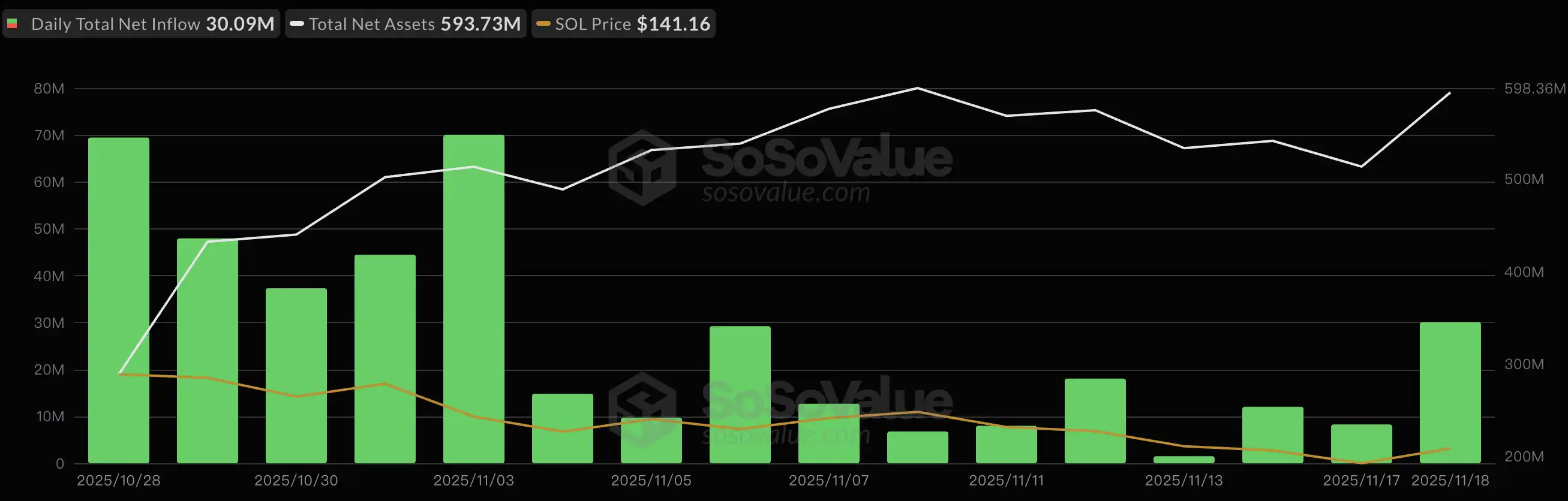 CoinGecko data shows that since the first Solana spot ETF was launched on October 28, the price of SOL has fallen by 31.34% to date.