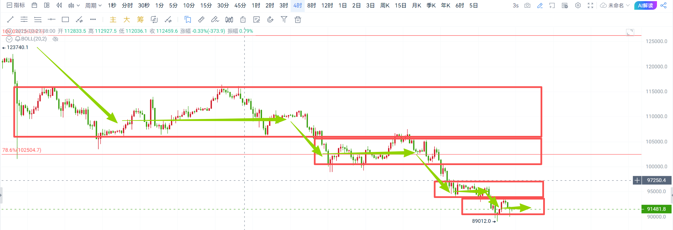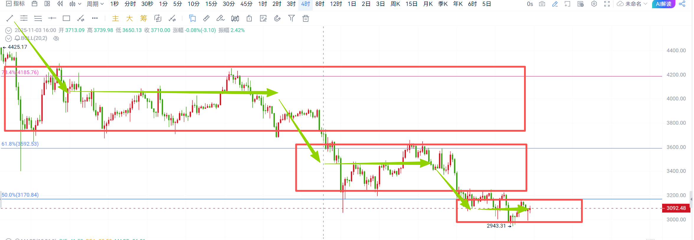 On the 4-hour level, Bitcoin's current movement is as previously mentioned, essentially a downward consolidation followed by a breakdown, continuing the bearish trend. The current consolidation range is still referenced at 90,000-92,000-94,000. Ethereum's rhythm is indeed a bit stronger than Bitcoin, with the current consolidation range referenced at 3,200-3,980!