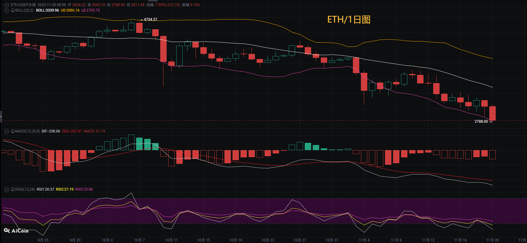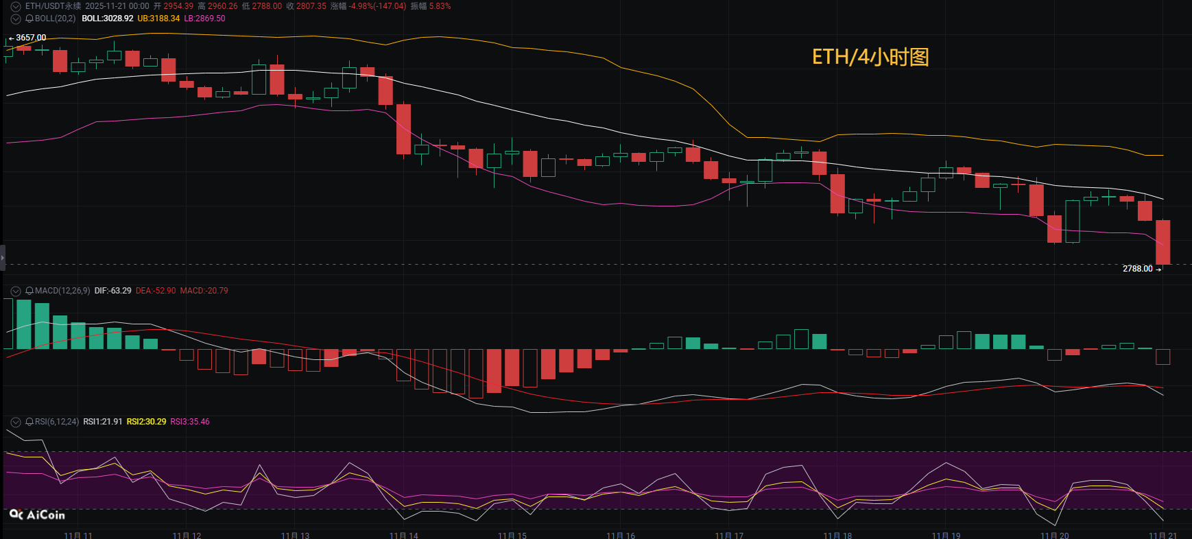 The daily K-line has seen consecutive large bearish candles with increased volume. On November 20, after a long lower shadow tested the bottom at 2790, there was a slight rebound, forming a single needle bottom structure. The EMA7 and EMA30 on the weekly level confirmed a death cross, and the current price of 2806 has fallen below all monthly moving averages (EMA7/30/120), indicating a mid-term bearish dominance. MACD: The daily DIF (-238) and DEA (-207) are accelerating downward, with the histogram expanding to -62, indicating strong bearish momentum; the hourly MACD has a golden cross below the zero axis but has not broken the downward trend line. EMA: The price is below EMA7 (3055)/EMA30 (3460)/EMA120 (3722) in a bearish arrangement, with the hourly EMA30 (2975) becoming the recent resistance level. Therefore, our strategy remains primarily bearish. The upper resistance to watch is in the range of 2960-3300.