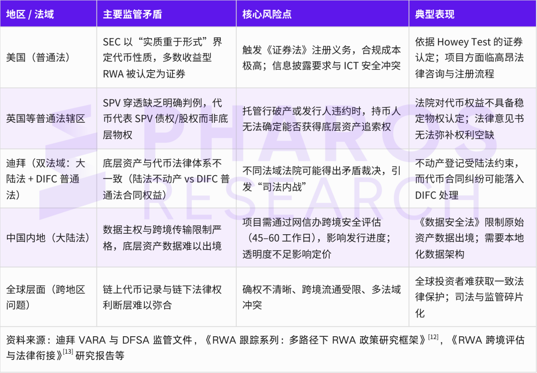 The global circulation of RWA and the regionality and sovereign regulation of underlying assets increasingly highlight conflicts, forming multiple legal fault lines. In dual-jurisdiction areas like Dubai, the underlying real estate follows civil law property rules, while the contractual rights represented by tokens may be established in common law financial centers (such as DIFC). This difference in legal systems may lead to contradictory rulings by courts in different jurisdictions when pursuing ownership, raising the risk of "judicial civil war." In the US, regulatory agencies continue to engage in a tug-of-war over the nature of tokens, with the SEC adhering to the principle of "substance over form," classifying most income-generating RWA tokens as securities through the Howey Test, forcing them to comply with strict registration processes under the Securities Act, imposing extremely high compliance costs and uncertainties on project parties. Compliance teams must seek a difficult balance between ongoing transparency in information disclosure and the confidentiality of ICT information security, further increasing the friction costs of regulatory adaptation.