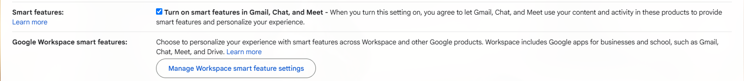 After toggling off “Turn on Smart Features in Gmail, Chat, and Meet,” users still need to go to the Manage Workspace Smart Features settings and toggle off Smart Features in Google Workspace and in other Google products to opt out entirely.
