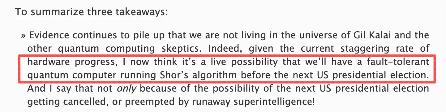 First, on November 13, Scott Aaronson, a leading figure in the field of quantum computing and director of the Quantum Information Center at the University of Texas, mentioned in an article: "I now believe that before the next U.S. presidential election, we may have a fault-tolerant quantum computer capable of running Shor's algorithm…"